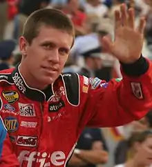 Green flag pit stops for tires, fuel, and car adjustments began on lap 53.[25] Fourteen laps later, a tire escaped from Ambrose's pit crew, and rested approximately 70 ft (21 m) in the infield.[28] Ambrose's gas man and firefighter Jimmy Watts ran across the grass, and was within 25 yd (23 m) of the track when he retrieved the tire.[26][29] Because Watts ventured into the infield, considered by NASCAR to be part of the track,[30] and with cars leaving turn four at near to 200 mph (320 km/h),[29] series officials waved the third caution.[3] NASCAR officials escorted Watts from pit road,[26] and he was suspended for the remainder of the event.[29] Kurt Busch made a second pit stop after a refuelling problem at a prior stop.[27] The caution meant 15 drivers were on the lead lap, and Johnson led at the lap-74 restart. Two laps later, Jeff Gordon's clutch developed a problem. On lap 78, Edwards overtook Hamlin for second. Edwards got past Johnson on the outside lane for the lead on the 81st lap. Three laps later, Johnson was passed by Hamlin on the inside line while in slower traffic for the third position. On the 103rd lap, Kurt Busch passed Edwards around the outside to claim the first position.[25] Labonte spun on the frontstretch on the lap, necessitating the fourth caution. Under caution, lapped drivers made pit stops for adjustments to their cars.[3][25]