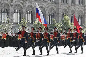 The 2009 Moscow Victory Parade was held on Victory Day on the 64th anniversary of the Great Patriotic War, which ended in the defeat of Nazi Germany. The parade was commanded by Valery Gerasimov, commander of the Moscow Military District, and reviewed by Anatoliy Serdyukov of the Russian Ministry of Defence. A speech was made by the third president of Russia, Dmitry Medvedev, in which he warned other countries against embarking on military adventures. This was thought to be a veiled warning directed at Georgian President Mikhail Saakashvili.[1] The Defense Ministry noted that the air parade is a de facto dress rehearsal for the jubilee parade that followed in honor of the 65th anniversary of Victory.[2]