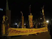 The committee's campaign featured posters featuring a drawing of a Muslim woman in an abaya and niqab, next to a number of minarets on a Swiss flag pictured in a way "reminiscent of missiles".[15] The Swiss People's Party also published a similar poster, with the minarets protruding through a Swiss flag.[16] A few days before the election, campaigners drove a vehicle near Geneva Mosque in the Le Petit-Saconnex imitating the adhan, the Islamic call to ritual prayer (salat) using loudspeakers.[17] Its neighbourhood voted by 1,942 votes to 1,240 to reject the ban.[18]