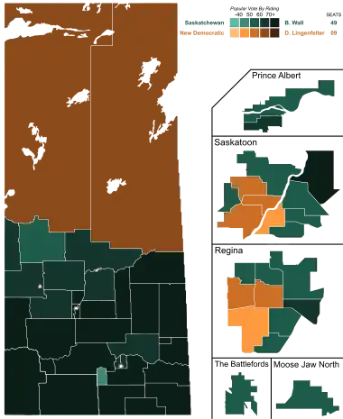 The 2011 Saskatchewan general election was held on November 7, 2011, to elect 58 members of the Legislative Assembly of Saskatchewan (MLAs).[2] The election was called on October 10 by the Lieutenant Governor of Saskatchewan, on the advice of Premier Brad Wall.[3] Wall's Saskatchewan Party government was re-elected with an increased majority of 49 seats, the third-largest majority government in the province's history. The opposition New Democratic Party was cut down to only nine ridings, its worst showing in almost 30 years.