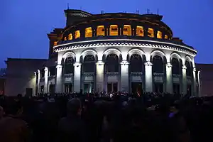 On 20 February 2013, Hovannisian and his supporters gathered in the Freedom Square. Hovannisian once gain claimed victory and called the people to stay in the square until tomorrow and meet President Sargsyan whose ruling party is expected to hold a rally there.[32] Opposition politician Nikol Pashinyan joined Hovannisian and addressed the people in Freedom Square.[33][34]