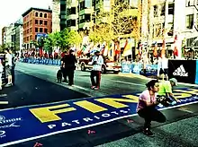 ![]() Lelisa Desisa Benti, male winner and Rita Jeptoo, female winner of the 2013 Boston Marathon, near the race's half-way point at the Wellesley College "Scream Tunnel". | |