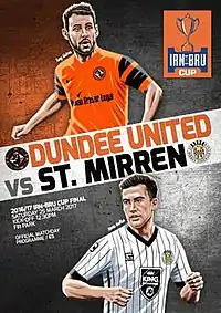The 2017 Scottish Challenge Cup final, also known as the Irn-Bru Cup final for sponsorship reasons, is a football match that took place on 25 March 2017 at Fir Park, between Dundee United and St Mirren.[1] It was the 26th final of the Scottish Challenge Cup since it was first organised in 1990 to celebrate the centenary of the now defunct Scottish Football League and the fourth since the Scottish Professional Football League was formed. Both teams progressed through four elimination rounds to reach the final. The match was won by Dundee United 2–1, marking their first win in the tournament since its inception and their first silverware since the 2009–10 Scottish Cup.[2][3]