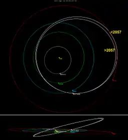 ![]() Orbit crossing from Venus to Mars, before and after 2057 Earth flyby | |