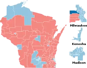 The Wisconsin State Assembly elections of 2018 were held on Tuesday, November 6, 2018. All 99 seats in the Wisconsin State Assembly were up for election. The Republican Party maintained a majority it has held since 2011,[1] winning 63 seats, a loss of one seat, and 44.75% of the voting share. Despite winning a majority of ballots cast, the Democratic Party won only 36 seats, thus remaining a minority and gaining just one seat from the Republicans, district 14. Democratic votes were concentrated in urban areas such as Milwaukee and Madison, while Republicans garnered votes in more rural areas, which has been widely attributed to the impact of gerrymandering in the post-2010 state redistricting.[2][3] Based on the 2018 results, the tipping point district was District 29, which the Republicans won by a margin of 12.12%, therefore Democrats would have needed to win the statewide popular vote by a margin of 20.36% to win a majority of seats.
