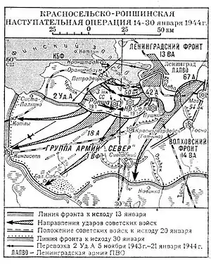 The assault began with air attacks overnight followed by a massive 65-minute artillery preparation and by the day's end the 2nd Shock Army's first echelon had gained as much as 3 km (1.9 mi) on a 10 kilometers (6.2 miles)-wide sector with 42nd Army's artillery providing support. That Army began its assault at 1100 hours on January 15 following a similar bombardment but its leading troops faced heavier resistance from three divisions of L Army Corps and it soon degenerated into a slugfest with 30th Guards Rifle Corps managing to penetrate no farther than 4km; a similar gain was made the next day. By January 17 the two Soviet armies were converging and the German positions north of Krasnoye Selo were threatened with encirclement. 116th Corps was committed the next day while 30th Guards Corps captured Krasnoye Selo and cut the road to Gatchina. Overnight on January 19/20 mobile units of 2nd Shock and 42nd Armies linked up in the Ropsha region as demoralized German troops filtered through their lines. On January 22 the Army commander, Col. Gen. I. I. Maslennikov, ordered his main shock group to assault German defenses around Gatchina at 1300 hours after a 15-minute artillery raid. This was led by the 123rd and 117th Rifle Corps, while 110th Rifle Corps advanced on Pushkin and Slutsk from the west and while the latter made progress the main attack hung up on powerful defenses. The effort was renewed on January 25 and finally the next day at 1000 hours the 224th, in cooperation with the 120th Rifle Division, cleared the town.[22] In recognition it received a battle honor: