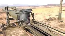 The 2S4 Tyulpan design shares the same chassis as the 2S3 Akatsiya, and carries an externally mounted 240 mm 2B8 mortar on the rear of the hull. The 2S4 has a capacity of 40 standard high-explosive rounds or 20 long-range rocket-assisted rounds.[10] These are placed in two automated drum-type magazines. The rounds are fed to the top of the carrier, where they are placed on a track. The mortar then tilts to the horizontal position. The breech opens and a ramming device pushes the round into the breech. The breech closes and the mortar tilts into the firing position. In combat, the mortar is elevated between 50° and 80°, and it can fire one round per minute.[11]