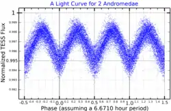2 Andromedae, abbreviated 2 And, is a binary star[4] system in the northern constellation of Andromeda. 2 Andromedae is the Flamsteed designation. It is a faint star system but visible to the naked eye with a combined apparent visual magnitude of 5.09.[3] Based upon an annual parallax shift of 7.7 mas,[2] it is located 420 light years away. The binary nature of the star was discovered by American astronomer Sherburne Wesley Burnham at Lick Observatory in 1889.[12] The pair orbit each other over a period of 74 years with a high eccentricity of 0.8.[4]