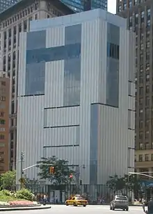 The building was designed by Edward Durell Stone for businessman Huntington Hartford, an heir to the A&P supermarket chain. It was originally a nine-story modernist structure.[2][15] Its exterior wall is made of reinforced concrete, which was used because it was more flexible to construct than a traditional steel structure.[16] The building uses Mo-Sai slabs, which are made of exposed aggregate concrete.[17] The exterior walls double as load-bearing walls, which support the concrete floor slabs inside.[18]