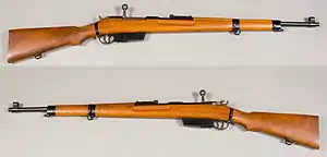 The FÉG 35M was a bolt-action rifle, chambered in 8×56mmR. Though superficially still resembling the 95/31M Carbine it was a new design with a cock-on-close bolt. An easily recognizable distinguishing feature was the placement of the bolt handle, which was further forward than in the 1895 design. It was used by Hungary in the years leading up to and during World War II, and after World War II before being gradually phased out by both Red Army surplus and locally produced Mosin–Nagant carbines.