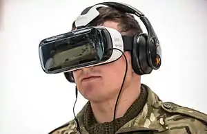 A person wearing a virtual reality headset, a type of near-eye 3D display.