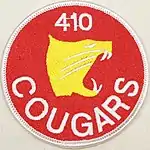 Sergeant Clarence (Leslie) Elm, CD, was detailed in 1943 by Wing Commander G.H. Elms to design a 410 Squadron badge. The 410 (Cougar) Squadron badge was approved by His Majesty King George VI in 1945. No. 410 Squadron's badge depicts a cougar's face with a background decrescent (waning) moon. The cougar, a North American mountain cat, was chosen because of the speed and power of its attacks. The waning moon refers to the squadron's night operations.[2] These two major devices are in reference to the squadron's Second World War night fighter activities, when the unit was renowned for its skill and number of victories.[2] The squadron's motto is Noctivaga, which means "wandering by night".[2]