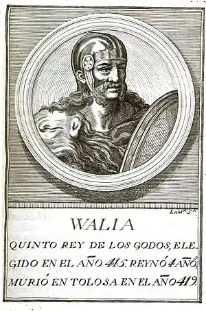 - The Visigoths invade the Iberian Peninsula and begin to conquer territory taken previously by the Vandals. King Ataulf and his pregnant wife Galla Placidia leave Gallia Narbonensis; they relocate at Barcelona. Their infant son, Theodosius, dies in infancy, eliminating an opportunity for a Roman-Visigothic line. Ataulf is assassinated in the palace while taking a bath. Sigeric succeeds him, but after a reign of seven days he is also murdered.