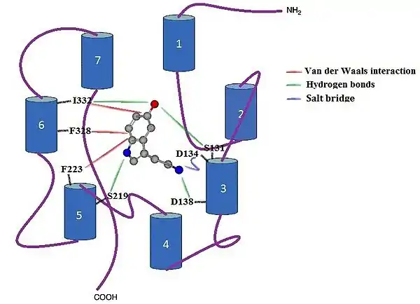 Serotonin is an endogenous non-selective agonist for the 5-HT2C receptor with a binding constant of Ki = 16.0 nM. When serotonin binds to the receptors, the most important contacts are in TM helixes 3, 5 and 6 (Figure 3), while the other four TM helixes do not interact directly with the serotonin compound. When binding of serotonin takes place, the protonated primary amine site forms a salt bridge with D134 residue in TM 3, as well as forming a hydrogen bond with residue S138 in TM 3. The aromatic indole ring forms a strong Van der Waals interaction with residues F223 in TM 5 and F328 in TM 6. The ring falls tight into the receptor pocket, stacked between two phenylalanines. Amine of the indole group forms a hydrogen bond with S219 residue in TM 5 and hydroxide substituent of the indole forms hydrogen bonds both with residue S131 in TM 3 and I332 in TM 6. There is also a strong Van der Waals interaction between the indole and I332 in TM 6.[29]
