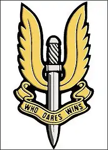 - The cap badge is a downward pointing flaming sword worked in cloth of a Crusader shield.[5] It was designed by Corporal Robert Tait, MM and Bar, following the usual British Army practice of holding a competition to design the cap badge for a new unit. The competition was held after the close of Operation Crusader. The motto is Who Dares, Wins. It was approved by the first Commanding Officer David Stirling, with the proposed wording 'Descend to Defend' or 'Strike and Destroy' disallowed. The sword depicted is the Sword of Damocles[6]