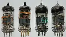 The 6DJ8 is a miniature nine-pin medium gain dual triode vacuum tube. It is distinguished by its very high transconductance, mostly the result of its frame grid construction. Versions of the tube are named ECC88, E88CC, 6922, E188CC, CV4108, 7308, 6N1P and 6N23P.