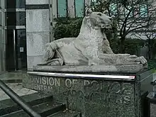 The building was constructed with two stone lion sculptures, nicknamed Patience and Perseverance, first installed at the original front entrance. The 9,000 lb (4,100 kg) lions have been moved three times – in 1991 to the new police headquarters at 120 Marconi Boulevard, in 2012 back to the original building, and in 2017 back to the new headquarters. The first move was prompted by the police offices moving, while the second was part of improving 77 North Front Street during its restoration and expansion. Columbus police were upset with the move, even though the new building was supposed to gain new sculptures. The police union backed the officers, and secured a donation from contractors to move the lion sculptures back to the new headquarters in 2017, where they remain today.[6][7]