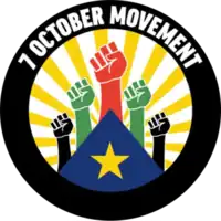 The 7 October Movementa is a South Sudanese opposition group founded by Kerbino Wol Agok. Wol, a businessman and philanthropist, was detained by the National Security Service without a charge in April 2018. He started a riot in the National Security Headquarters, or Blue House, on October 7, 2018, from which the group gets its name, and was sentenced to 10 years in prison. However, he was pardoned by president Salva Kiir in January 2020.[2] Wol announced that he had founded the movement on June 5, 2020, and at that time claimed to have 1,000 men in the rural areas of South Sudan.[1] Wol claimed that many members of the movement fought under John Garang in the Second Sudanese Civil War, and also that many of them had been prisoners in the Blue House. The group is opposed to the current leadership, which the 7 October Movement believes have kept South Sudan in poverty, as well as the National Security Service and the current prison system, which the group believes is unjust.[3]