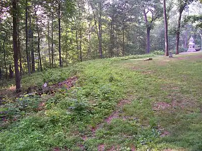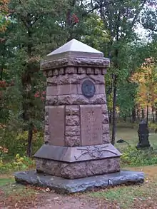The 7th Ohio Infantry's monument is located near Gettysburg, Pennsylvania in Adams County. It is a simple stone structure located at the intersection of Slocum Avenue and Williams Avenue, on the right when traveling north on Slocum Avenue. It lies on the "saddle" between the lower and upper crest of Culp's Hill in Gettysburg National Military Park. Dedicated on 14 September 1887, it marks the position held by the regiment on 2 and 3 July 1863. It is vertical with mostly rough-hewn surfaces and an apexed top. There is a polished inscription stone on each one of its sides. On two faces, towards the top, are State Seal and unit reliefs. A relief of crossed muskets with a wreath in the center is on the lower front sloped surface. A Corps star insignia appears on the top of the front inscription tablet. It was constructed by Smith Granite Company.