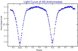 The orbital plane of the two stars is aligned to our line of sight, so each component eclipses the other when passing in front of it. In AD Andromedae this cycle repeats with a period 20 minutes less than one day.[3]