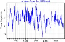 AH Scorpii is a dust-enshrouded red supergiant[10] and is classified as a semiregular variable star with a main period of 714 days. The total visual magnitude range is 6.5 - 9.6.[2] No long secondary periods have been detected.[11] Modelling of AH Scorpii near maximum light has determined an effective temperature of 3,682±190 K and a luminosity of 330,000+270,000