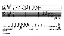 The sophisticated software written by John Ridges for this synthesizer was the first to implement graphical entry for a personal computer music product.[16] At the time, his music entry program was the largest Assembly Language program available for the Apple II[17] (even larger than the entire Applesoft BASIC language interpreter), and one of the few programs to utilize Apple's hi-resolution graphics. It was also perhaps the first software for an Apple computer to use a graphical user interface (GUI) with icons and pointing elements (the "IMP" portion of WIMP interfaces);[18] several years ahead of Apple's Macintosh. Since the Apple II had no mouse, the GUI was implemented using the Apple's "game paddles"; one moved an arrow to select the desired icon, and the other moved the selected icon to the desired position on the musical staff on the screen display. When entering a musical note, the sound of the note was simultaneously played by the synthesizer for confirmation that the correct pitch had been selected.[19]