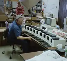 The CS6 Turbo II was also available in a version for use with automatic disk loaders, such as the Mountain Computer model 3200.[38] When using an automatic loader, blank disks are fed from a stack in a hopper, rather than manually placed into drives one at a time. The loader has two output bins, one for good copies and one for defective disks. Each Turbo II system could operate one or two automatic loaders.