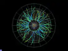 Up to 3,000 charged particles were emitted from each collision, shown here as lines radiating from the collision point. The colors of the lines indicate how much energy each particle carried away from the collision.