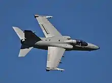Drawing on experience from the Panavia Tornado, the AMX is equipped with a hybrid flight control system; a fly-by-wire control system is employed to operate flight control surfaces such as the spoilers, rudder and variable incidence tailplane, while the ailerons and elevators are actuated via a dual-redundant hydraulic system. Manual reversion is provided for the ailerons, elevator and rudder to allow the aircraft to be flown even in the event of complete hydraulic failure; either control system can act independent of one another.[9][10] The wing is fitted with both leading edge slats and trailing edge flaps and overwing spoilers ahead of the flaps. The spoilers can function as airbrakes and to negate lift; improving take-off and landing performance as well as manoeuvrability during flight.[11]