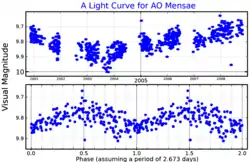 AO Mensae is a single[8] variable star in the southern circumpolar constellation of Mensa. It is too faint to be viewed with the naked eye, having an apparent visual magnitude that ranges from 9.96 down to 10.18.[3] The star is 128 light years distant from the Sun based on parallax,[2] and is drifting further away with a radial velocity of +16 km/s.[6] It is a member of the Beta Pictoris moving group, a loose association of young stars moving through the galaxy.[8]