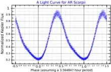 AR Scorpii is the first "white dwarf-pulsar" to be discovered.[7] Its unusual nature was first noticed by amateur astronomers.[8] The 3.56-hour period in AR Scorpii's light curve caused it to be misclassified as a Delta Scuti variable, but in 2016, this period was found to be the binary orbital period. In addition, the system shows very strong optical, ultraviolet, and radio pulsations originating from the red dwarf with a period of just 1.97 minutes, which is a beat period from the orbital rotation and the white dwarf spin.[3] These pulsations occur when a relativistic beam from the white dwarf sweeps across the red dwarf, which then reprocesses the beam into the observed electromagnetic energy. Although the white dwarf shows evidence of accretion in the past, at present it is not accreting significantly, and the system is powered by the spin-down of the white dwarf.[7][5] The white dwarf's rotation will slow down on a timescale of 107 years.[5] It has a radius of about 7×103 km,[5] about the same size as Earth.