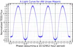 AW Ursae Majoris is a binary star system in the northern circumpolar constellation of Ursa Major, abbreviated AW UMa. It is an A-type W Ursae Majoris variable[7] (W UMa) with an apparent visual magnitude of 6.83, which is near the lower limit of visibility to the naked eye. This is an eclipsing binary with the brightness dropping to magnitude 7.13 during the primary eclipse and to 7.08 with the secondary eclipse.[3] Parallax measurements give a distance estimate of 221 light years from the Sun. It is drifting closer to the Sun with a radial velocity of approximately −17 km/s.[5] The system has a high proper motion, traversing the celestial sphere at the rate of 0.216 arc second per annum.[12]