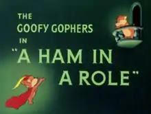 A Ham in a Role is a 1949 Warner Bros. Looney Tunes short starring the Goofy Gophers along with an unnamed dog who is based on stage/film actor John Barrymore.[3] The cartoon was planned by Arthur Davis, but was finished and directed by Robert McKimson. It was released by Warner Bros. Pictures on December 31, 1949,[4][5] but some sources list the release date as January 1, 1950.[6] The cartoon draws heavily from the works of William Shakespeare, with its gags relying on literal interpretations of lines from Hamlet, Julius Caesar, Richard III, and Romeo and Juliet.