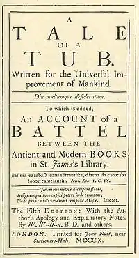 A Tale of a Tub was the first major work written by Jonathan Swift, composed between 1694 and 1697 and published in 1704. It is arguably his most difficult satire, yet considered by some to be his best. The Tale is a prose parody divided into sections of "digression" and a "tale" of three brothers, each representing one of the main branches of western Christianity. A satire on the Roman Catholic and Anglican churches and English Dissenters, it was famously attacked for its profanity and irreligion, starting with William Wotton, who wrote that it made a game of "God and Religion, Truth and Moral Honesty, Learning and Industry" to show "at the bottom [the author's] contemptible Opinion of every Thing which is called Christianity."[1] The work continued to be regarded as an attack on religion well into the nineteenth century.[2][3] One commentator complained that Swift must be "a compulsive cruiser of Dunghils … Ditches, and Common-Shores with a great Affectation [sic] for every thing that is nasty. When he spies any Objects that another Person would avoid looking on, that he Embraces.” [4]
