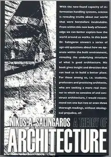 A Theory of Architecture is a book on architecture by Nikos Salingaros, published in 2006 by Umbau-Verlag, Solingen, Germany ISBN 3-937954-07-4. Cover recommendations are by Kenneth G. Masden II, Duncan G. Stroik, Michael Blowhard,[1] and Dean A. Dykstra. Preface by Prince Charles, and Foreword by Kenneth G. Masden II.[2] This book is a re-working of previously published articles used to teach a senior architecture studio class. Four of the twelve chapters were originally written in collaboration, and the co-authors include Michael Mehaffy, Terry Mikiten, Debora Tejada, and Hing-Sing Yu.