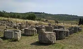 "The polygonal walls of the acropolis may still be seen in a fair state of preservation on a circular hill standing about 500 ft. [150 m] above the little plain of Exarcho; one gateway remains, and there are also traces of town walls below. The temple site was on a low spur of the hill, below the town. An early terrace wall supports a precinct in which are a stoa and some remains of temples; these were excavated by the British School at Athens in 1894, but very little was found."[19]