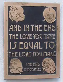 "The End" features Starr's only drum solo in the Beatles' catalogue (the drums are mixed across two tracks in "true stereo", unlike most releases at that time where they were hard-panned left or right). Fifty-four seconds into the song are 18 bars of lead guitar: the first two bars are played by McCartney, the second two by Harrison, and the third two by Lennon, and the sequence is repeated two more times.[71] Harrison suggested the idea of a guitar solo in the track, Lennon decided they should trade solos and McCartney elected to go first. The solos were cut live against the existing backing track in one take.[7] Immediately after Lennon's third and final solo, the piano chords of the final part of the song begin. The song ends with the memorable final line, "And in the end, the love you take is equal to the love you make". This section was taped separately from the first and required the piano to be re-recorded by McCartney, which was done on 18 August.[71] An alternative version of the song, with Harrison's lead guitar solo played against McCartney's (and Starr's drum solo heard in the background), appears on the Anthology 3 album and the 2012 digital-only compilation album Tomorrow Never Knows.[72]