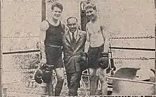 Facing another well known opponent in an exhibition match on November 16, 1918, Hollandersky met the former light and welterweight world champion Joe Walcott in New London for a four-round match to benefit the United War Workers of America. The bout showcased intense boxing strategy, though Walcott was well past his prime. Appearing as the headliner for the benefit was Larry Williams, a light heavyweight of considerable skill, who would act as a sparring partner for Jack Dempsey in 1921 and later for Dempsey's successor as world heavyweight champion, Gene Tunney.[100] Williams would appear with Abe in MGM's The Crowd Roars (1938). A photograph of Hollandersky with Williams and Gene Tunney, likely taken at a boxing benefit or training match, appear in most editions of Abe's book.[101][102]