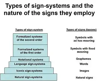 The theory of general semiotics arranges the types of sign-systems in a hierarchy that reflects this gradual development. Each higher level in the hierarchy represents basic signs of more abstract character – more remote from the things they denote – than the basic signs of the level below it. This hierarchy is illustrated in the diagram above.