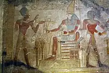 Today, Abydos is notable for the memorial temple of Seti I, which contains an inscription from the Nineteenth Dynasty known to the modern world as the Abydos King List. This is a chronological list showing cartouches of most dynastic pharaohs of Egypt from Menes until Seti I's father, Ramesses I.[3] It is also notable for the Abydos graffiti, ancient Phoenician and Aramaic graffiti found on the walls of the Temple of Seti I.