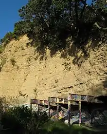 At low tide there is an interesting walk from Ladies Bay along the base of the cliffs to St Helier's Bay. The rocky shoreline overlooks the Waitemata Harbour which itself occupies a drowned valley system cut in marine sediments of Miocene Age (15–25 million years ago). Generally, around Auckland these soft Miocene sediments are alternating Waitemata series sandstone and mudstone with more massive beds of sandstone sometimes with minor occurrences of limestone.[3] The concretions that can be easily seen, are formed by the action of ground water with dissolved minerals (mainly calcium carbonate of which limestone is made) percolating through the layers. Calcium carbonate is an important component of concrete and fills in the pore spaces between grains of sediment thereby cementing the grains together and making them more durable against erosion.