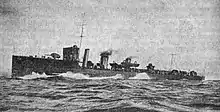 The revised machinery layout freed up deck space, allowing heavier armament to be carried.[9] Gun armament consisted of two 4-inch (102 mm) BL Mk VIII guns,[lower-alpha 2] one on the ship's forecastle and one aft, and two 12-pounder (76 mm) QF 12 cwt guns[lower-alpha 3] carried in the waist position between the first two funnels.[1][8] Unlike the Beagles, the forecastle gun was not raised on a bandstand, as it was felt that in heavy seas this generated additional spray.[8] As with the Beagles, torpedo armament consisted of two 21-inch (533 mm) torpedo tubes, with two reload torpedoes carried, although the tubes were longer, allowing more modern torpedoes to be carried. The torpedo tubes were aft of the funnels, mounted singly with a searchlight position between them.[8] Wartime modifications included the addition of a 3-pounder (47 mm) Vickers anti-aircraft gun and depth charges.[1][10]