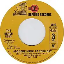 "Add Some Music to Your Day" is a song by American rock band the Beach Boys that was released in the US on February 23, 1970[1] as the lead single from their album Sunflower. It was written by Brian Wilson, Joe Knott and Mike Love. Wilson later said that Knott "was a friend of mine who wasn't a songwriter but he contributed a couple of lines. But I can't remember which ones!"[2]