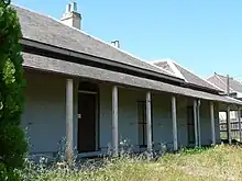 A slate roofed verandah, supported by simple rectangular posts onto stone flags, borders the house on the eastern and southern sides. Colonial shuttered French doors open onto the verandah.[1][7]
