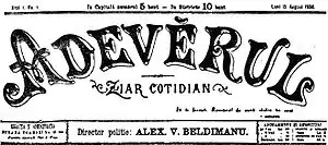 A newspaper by the name Adevĕrulŭ (pronounced the same as Adevărul, but following versions of the Romanian alphabet which emphasized etymology, in this case from the Latin word veritas) was founded on December 15, 1871.[4] The weekly was owned by Alexandru Beldiman, a former Police commander, and published in Iași, the former capital of Moldavia. Beldiman directed the newspaper in opposition to Romania's new Domnitor, the German prince Carol of Hohenzollern, calling for the restoration of his deposed and exiled predecessor, the Moldavian-born Alexandru Ioan Cuza.[4] Its articles against the new monarch soon after resulted in Beldiman's indictment for defamation and attack on the 1866 Constitution.[4] He was eventually acquitted, but the journal ceased publication with its 13th issue (April 1872).[4]