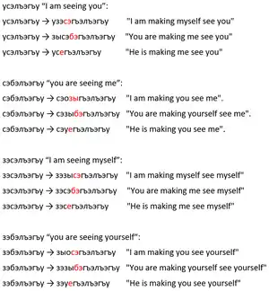 | Around | ӏу~ [ʔʷə~] | ӏуаплъэ [ʔʷaːpɬa] "(s)he is looking around" | ӏуедзэ [ʔʷajd͡za] "(s)he is throwing around" |