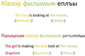 кӏалэр пшъашъэм еплъа е кӏалэм пшъашъэр къеплъа? кӏалэ-р пшъашъэ-м еплъ-а е кӏалэ-м пшъашъэ-р къ-еплъ-а? [t͡ʃʼaːɮar pʂaːʂam japɬaː ja t͡ʃʼaːɮam pʂaːʂar qajpɬaː] boy (abs.) girl (erg.) is (s)he looking at it? or boy (erg.) girl (abs.) is (s)he looking at it? "Is the boy looking at the girl or is the girl looking at the boy?"