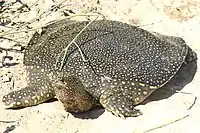 The African softshell turtle or Nile softshell turtle (Trionyx triunguis) is a large species of turtle from fresh-water and brackish habitats in Africa (larger parts of East, West and Middle Africa) and the Near East (Israel, Lebanon, Syria and Turkey).[3] It is the only extant species from the genus Trionyx, but in the past many other softshell turtles were placed in this genus; they have now been moved to various other genera.[3] Despite the name "African softshell turtle", it is not the only species or genus of softshell turtle in Africa (the genera Cyclanorbis and Cycloderma are also African).[3] It is a very large species of softshell turtle, with sizes that range from 85 to 94 cm, a weight of 40 kg, and an unconfirmed max size of 120 cm. They are omnivores in diet, consuming small fish, crustaceans, and also palm seeds and fallen leaves.