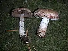Agaricus arorae is a moderate-sized, forest-dwelling mushroom that exhibits distinctive color changes. It fruits early in the mushroom season. Unusually within the genus Agaricus, the mushroom's cap cuticle turns yellow when exposed to a base such as potassium hydroxide or sodium hydroxide but stains red when cut.[1] In the field, it has a brownish, fibrillose/squamulose cap, which turns red when bruised. Agaricus arorae was first described from Santa Cruz County but since has been found in San Mateo and Alameda counties.[2][3][4] Agaricus arorae can be distinguished by its scales and a conspicuous stipe.[5]