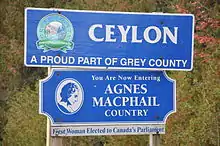 - On June 24, 2006, a cairn and bronze bust commemorating Agnes Macphail's life was unveiled in Hopeville, Ontario. The same year, highway signs labelled "You are now entering Agnes Macphail Country" were placed at the eastern approach to the hamlet of Ceylon, at the intersection of Grey Roads 4 and 14 (known locally as "Six Corners"), and on Grey Road 9, east of Hopeville. Grey County Road 9 between Highway 6 and Highway 10 was named Agnes MacPhail Road.[19]